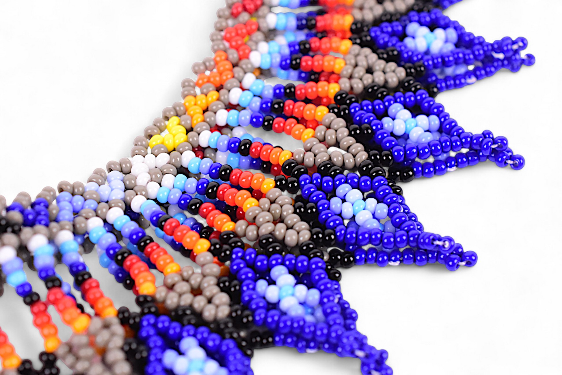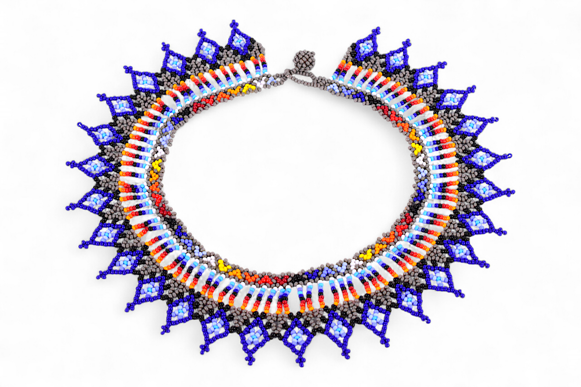 Make a bold and meaningful statement with this stunning beaded necklace. Designed with a layered silhouette and pointed fringe, this piece is handmade by Indigenous Embera Chami artisans using traditional beading techniques and carefully selected glass beads in radiant shades of royal blue, light blue, grey, white, red, yellow, and black.