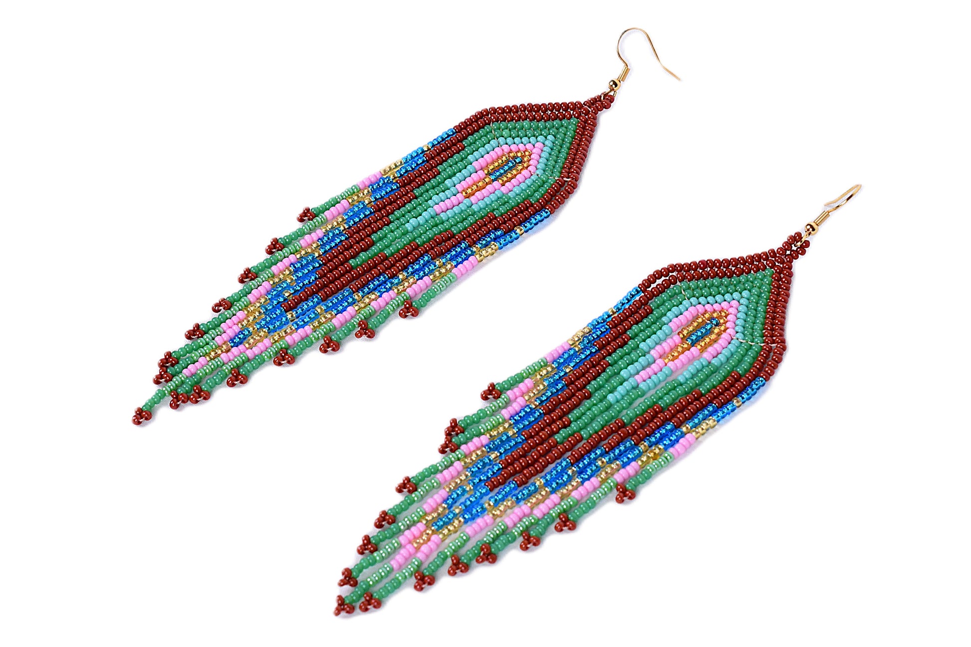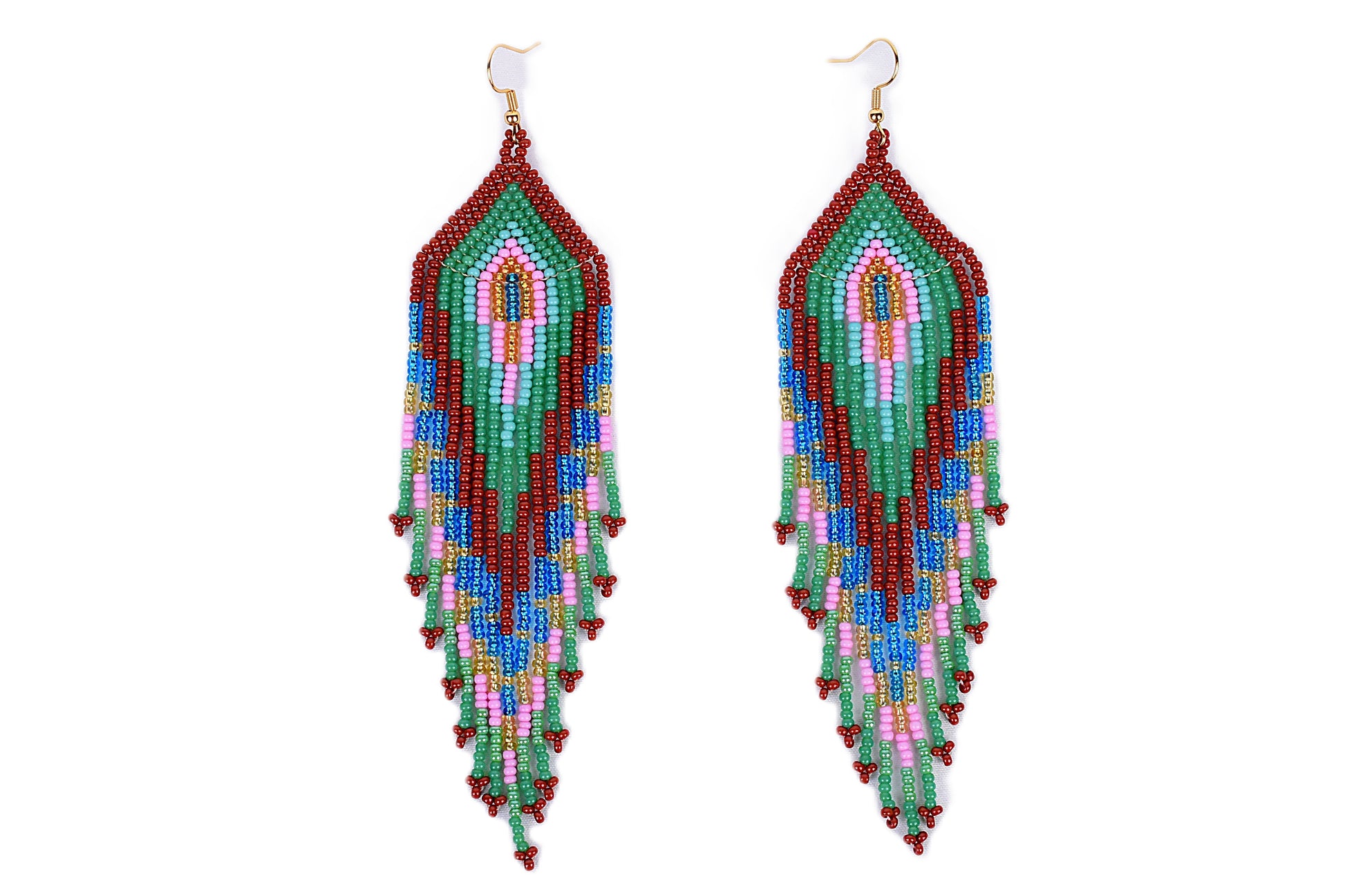 Make a bold and meaningful statement with these radiant feather-inspired earrings. Designed with intricate beadwork, they feature layers of emerald green, earthy brown, sky blue, blush pink, golden yellow, and hints of orange. The long fringe shape moves gracefully, capturing light and color with every step.