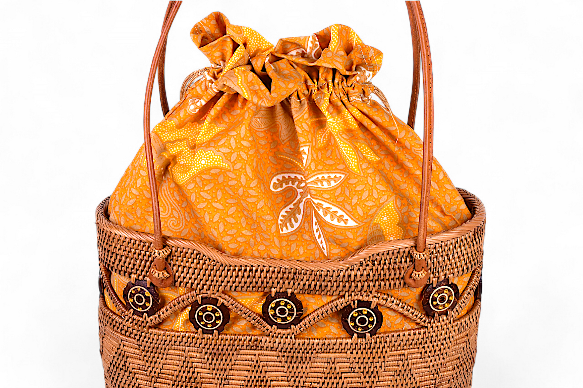 Every bag begins with natural rattan fibers, harvested and carefully processed by hand. Artisans clean, dry, and smoke the fibers to strengthen them before weaving them into shape. From harvesting and preparing the natural rattan to weaving each strand, carving the coconut shell accents, and stitching the batik lining, artisans dedicate days to creating a single piece. The result is a tote that is not only durable and practical but also a unique work of art.