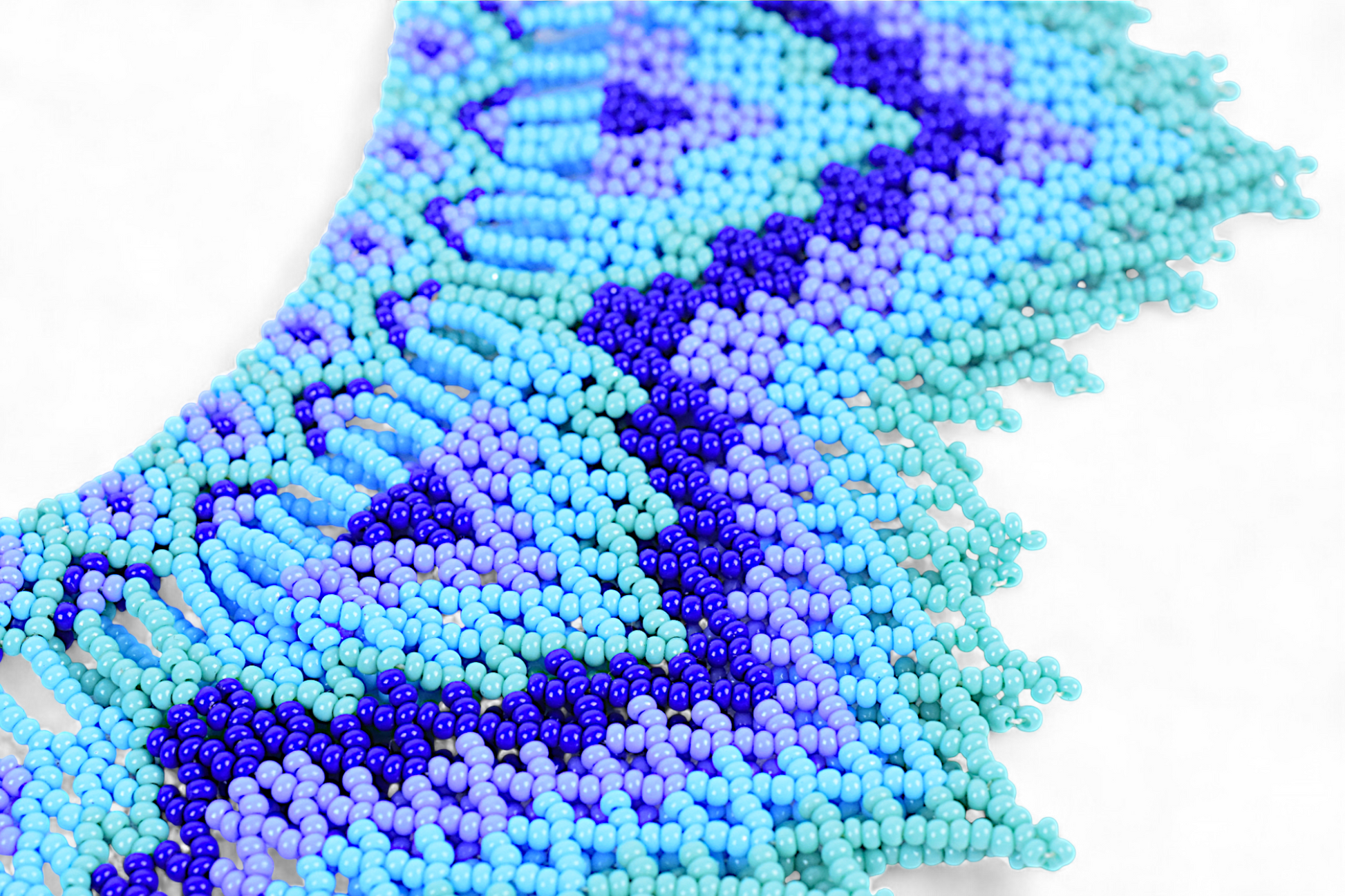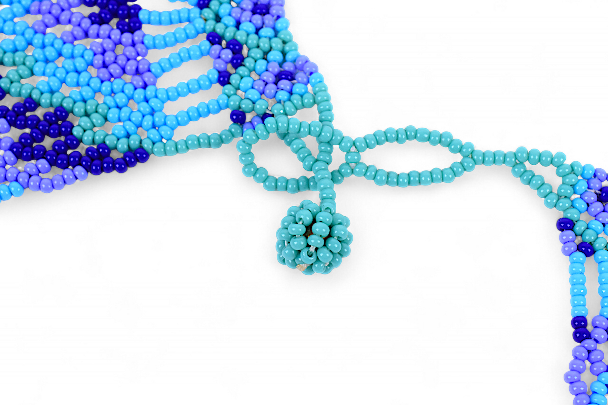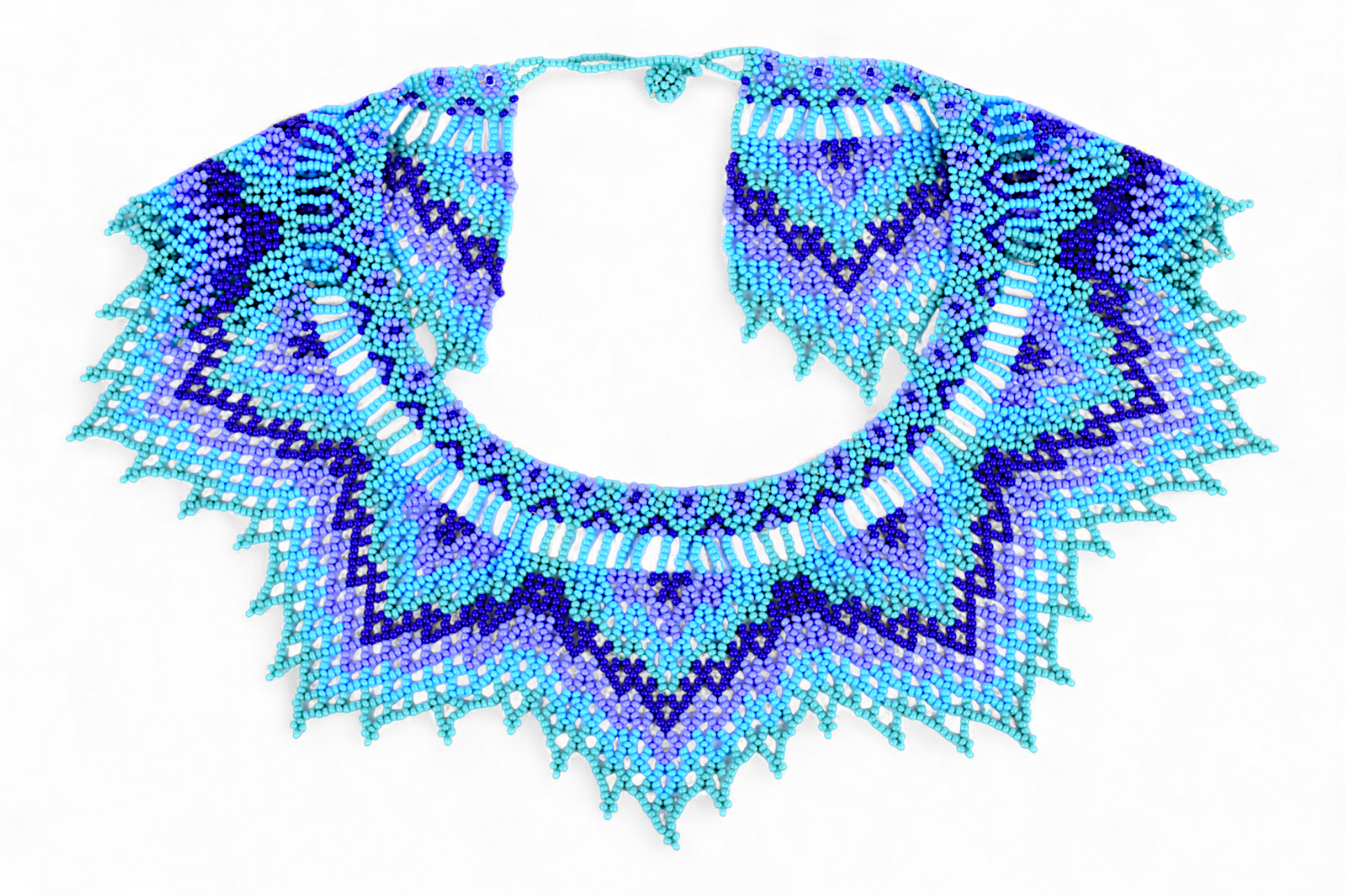 Make a bold and meaningful statement with this stunning beaded necklace. Designed with a layered chevron silhouette, this piece is handmade by Indigenous Embera Chami artisans using traditional beading techniques and carefully selected glass beads in radiant shades of teal, blue, lilac, and navy blue