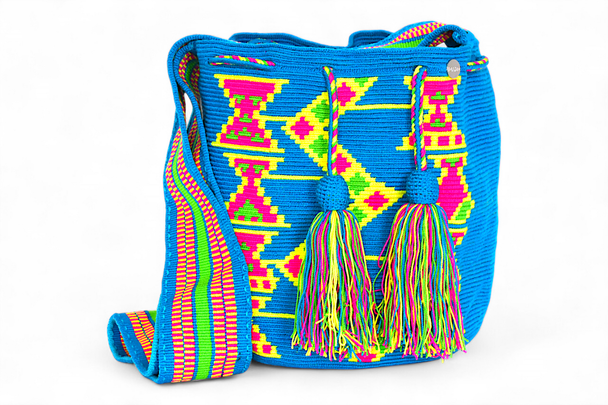 Handmade Large Wayuu Crossbody Bag – Boho Crochet Bucket Bag with Blue, Neon Green, Pink & Yellow Geometric Design