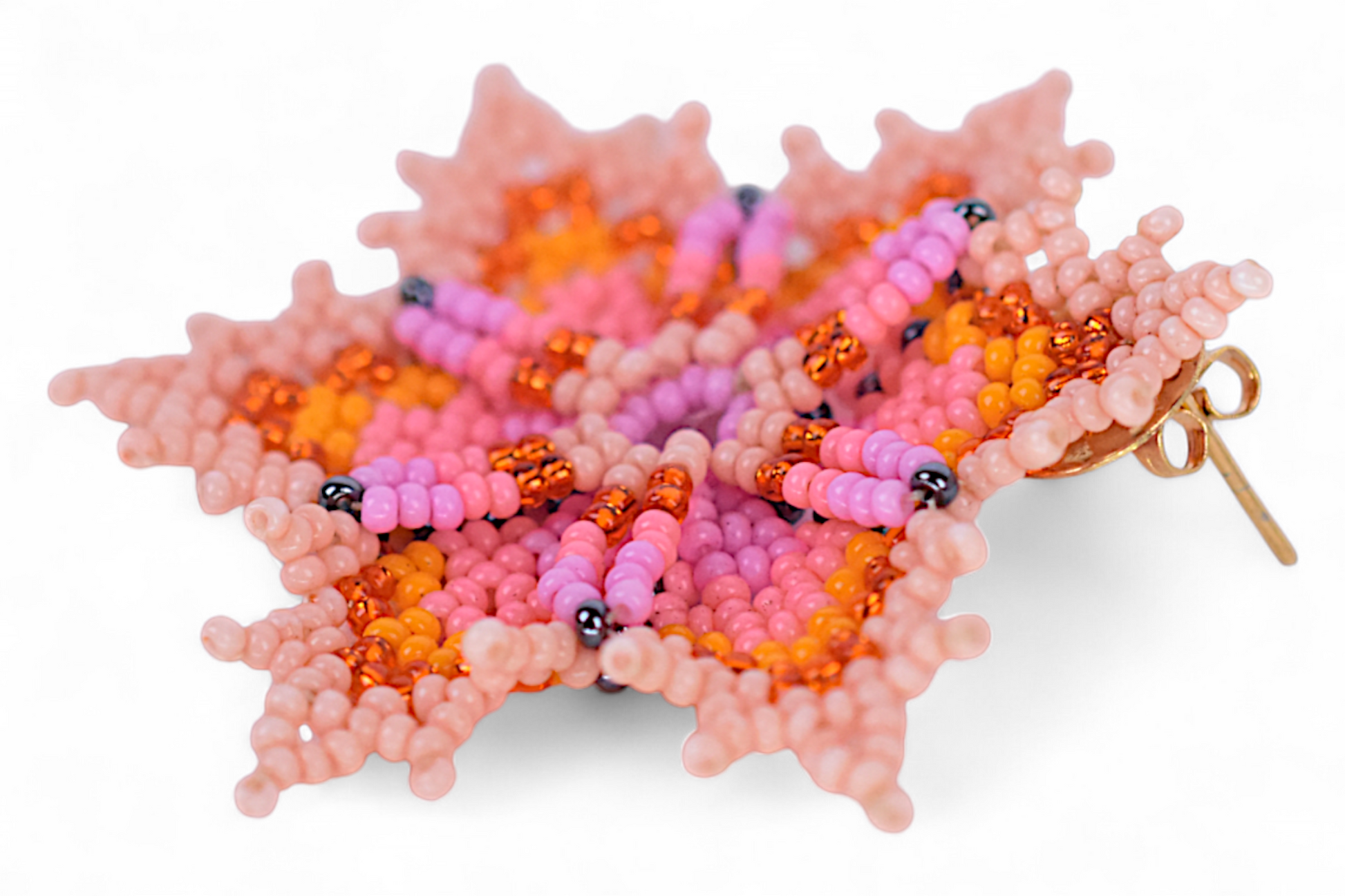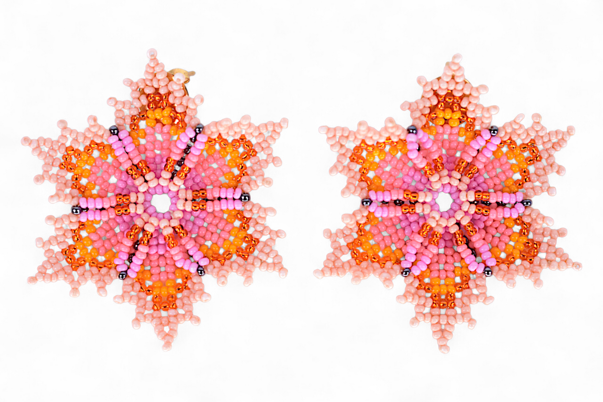 Make a bold and meaningful statement with these stunning floral earrings. Shaped like a blooming six-petal flower, this piece is handmade by Indigenous Embera Chami artisans using traditional beading techniques and carefully selected glass beads in radiant shades of peach, pink, orange, and hints of bronze.