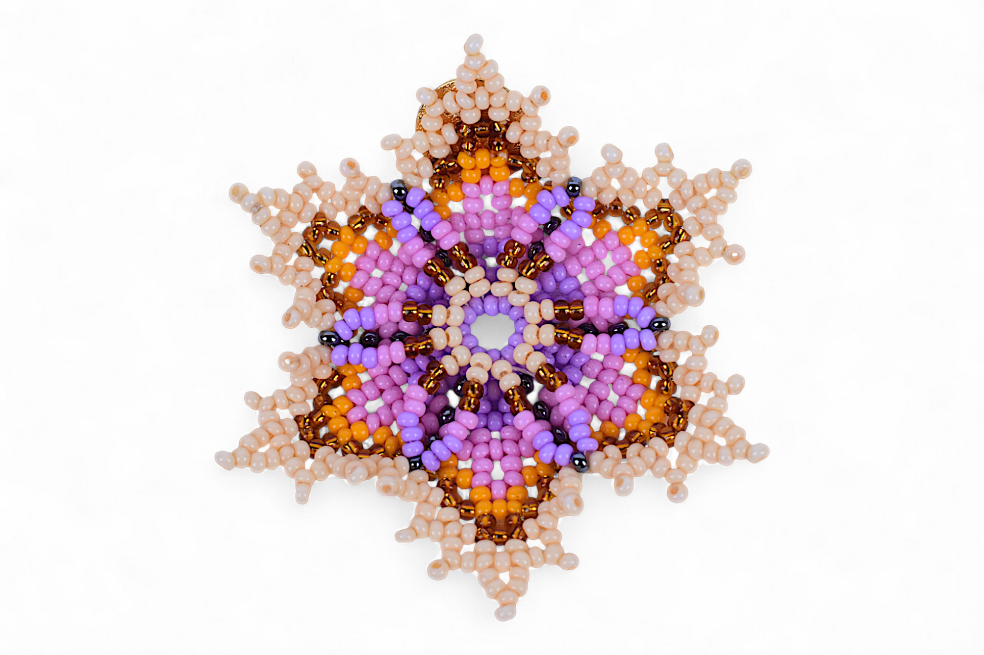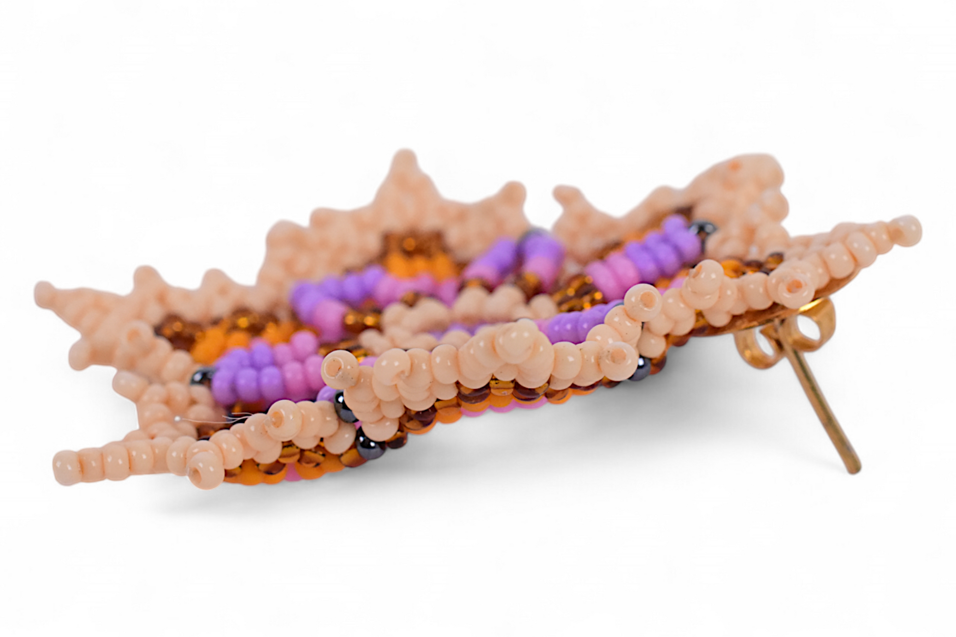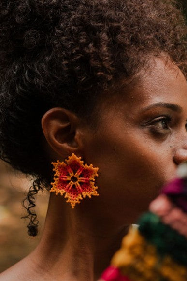 Make a bold and meaningful statement with these stunning floral earrings. Shaped like a blooming six-petal flower, this piece is handmade by Indigenous Embera Chami artisans using traditional beading techniques and carefully selected glass beads in vibrant purple, orange, bronze, and cream tones.