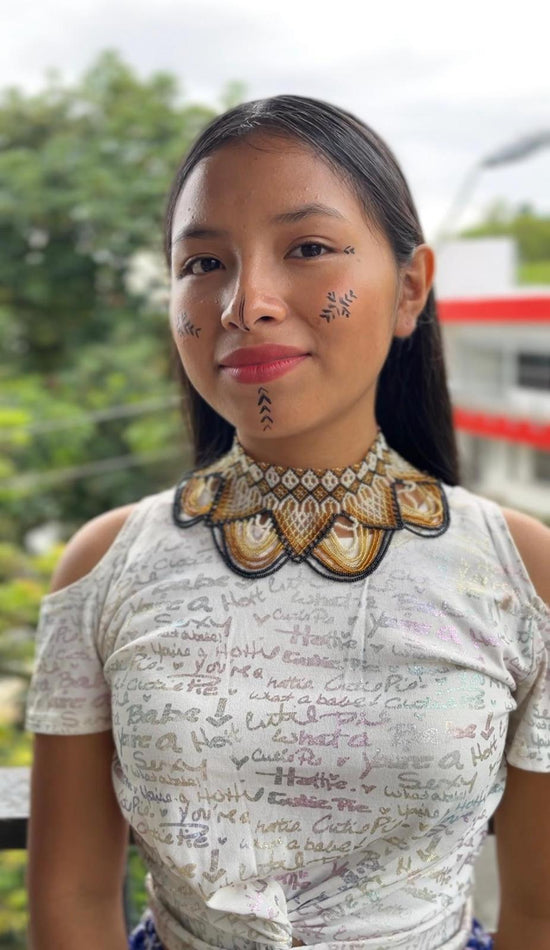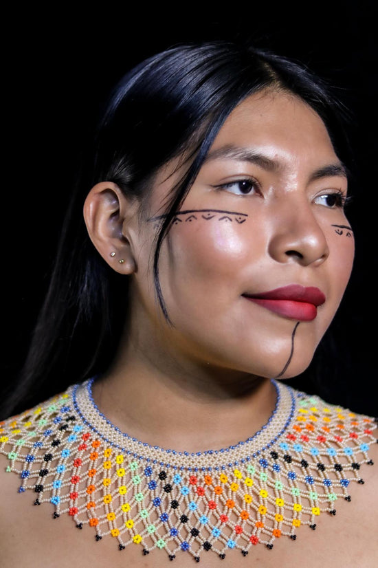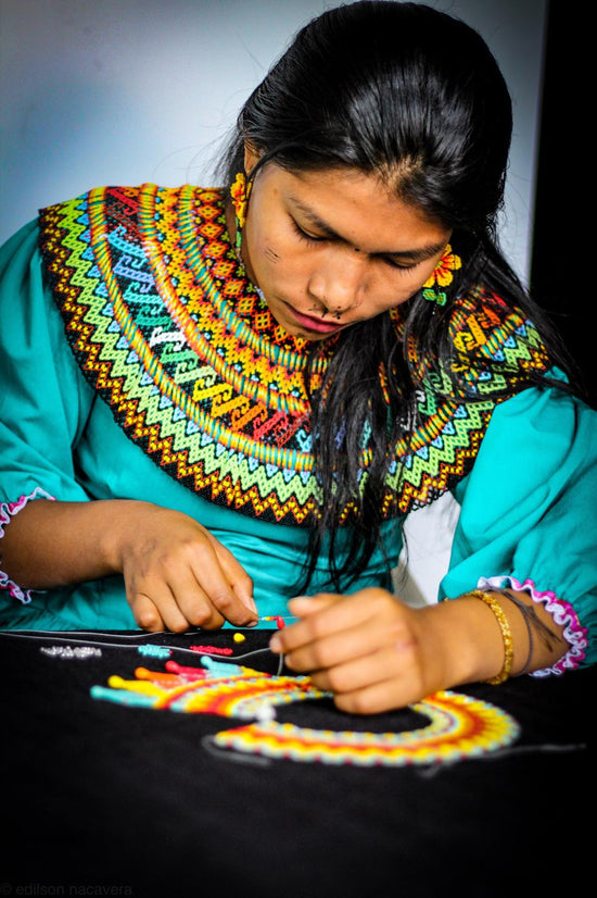 The symmetrical floral design mirrors sacred patterns found in nature, used by the Embera Chami to express harmony, identity, and storytelling through art.