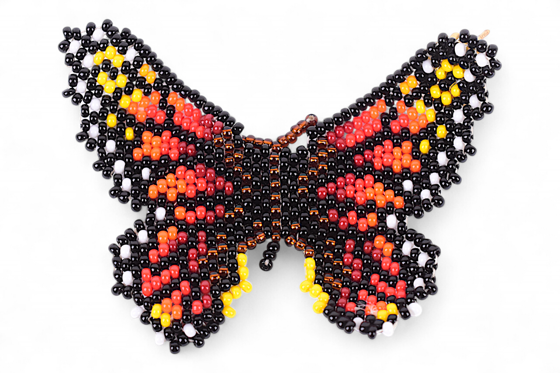 Make a bold and meaningful statement with these stunning butterfly earrings. Designed with a graceful winged silhouette, this piece is handmade by Indigenous Embera Chami artisans using traditional beading techniques and carefully selected glass beads in vibrant shades of orange, black, yellow, white, and bronze.
