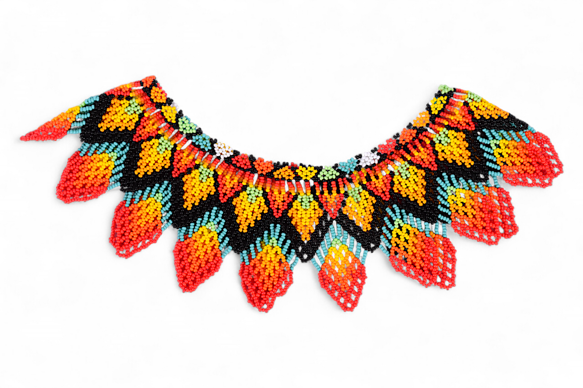 Make a bold and meaningful statement with this stunning beaded necklace. Designed with a cascading, flame-inspired silhouette, this piece is handmade by Indigenous Embera Chami artisans using traditional beading techniques and carefully selected glass beads in radiant shades of red, orange, yellow, green, turquoise, black, and white.