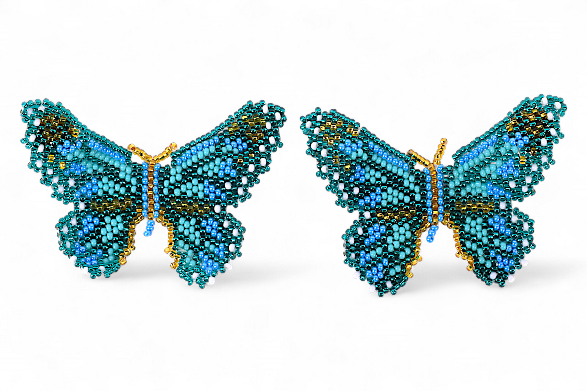 Make a bold and meaningful statement with these stunning butterfly earrings. Designed with a graceful winged silhouette, this piece is handmade by Indigenous Embera Chami artisans using traditional beading techniques and carefully selected glass beads in vibrant shades of teal, green, blue, and white.