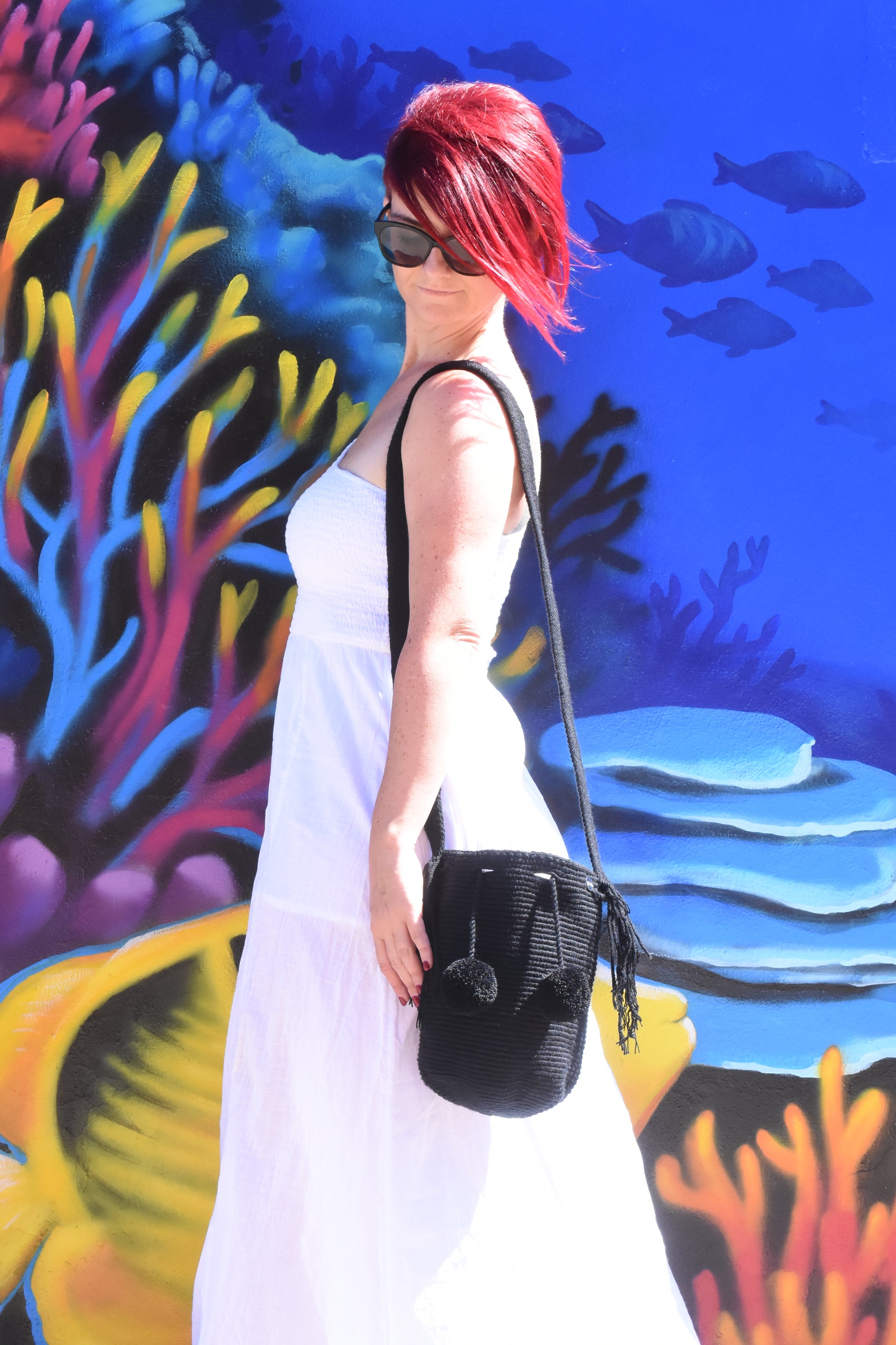 Embrace elegance with this stunning black handbag, adorned with two matching coloured pom poms that add a touch of playfulness and charm. Crafted with precision and love, this handmade Wayuu bag is a perfect blend of simplicity and sophistication, making it an ideal accessory for any occasion.