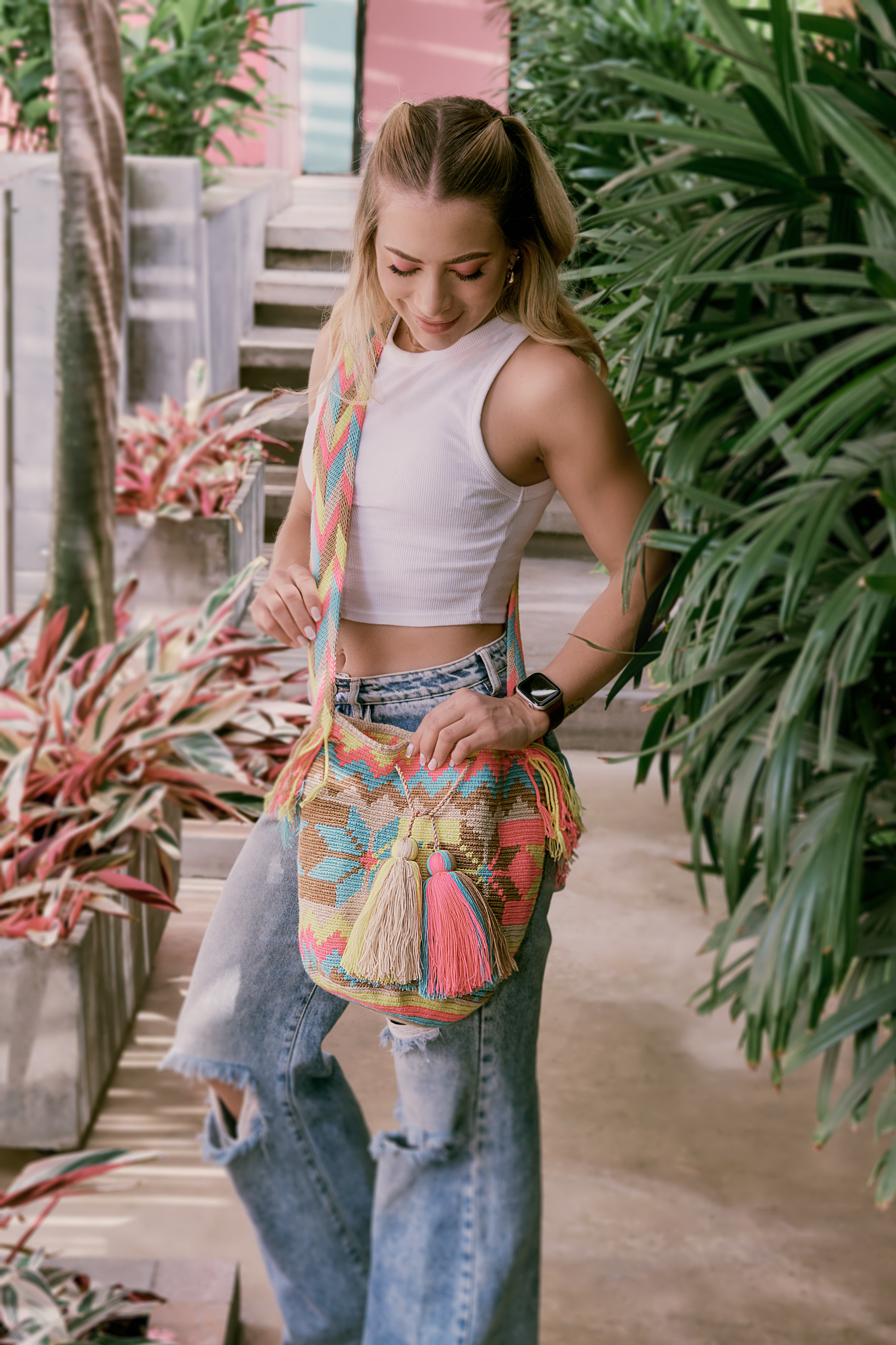 What makes this tassel bag truly exceptional is its unique and stunning design, a testament to the artistry of handcrafting by the Wayuu community. Each wayuu bag takes 7-10 days to make; it is a one-of-a-kind creation, ensuring that you carry a piece of tradition and culture wherever you go.