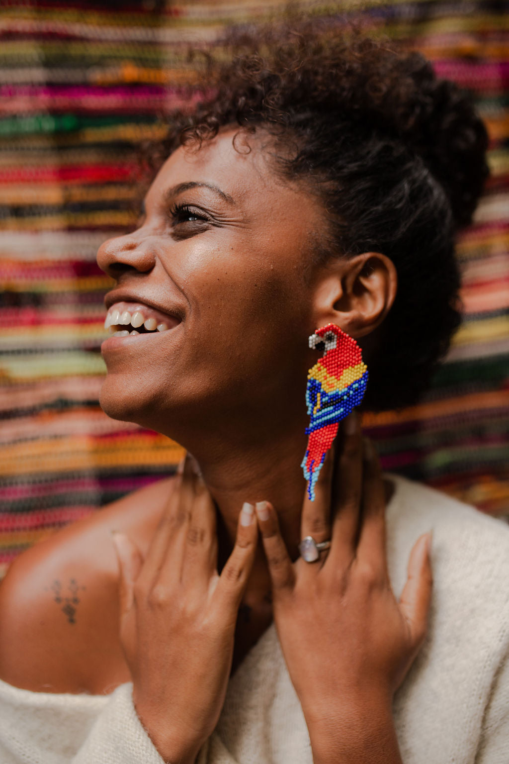 Make a bold and meaningful statement with these stunning bird-inspired earrings. Designed in the vibrant silhouette of a perched tropical parrot, this piece is handmade by Indigenous Embera Chami artisans using traditional beading techniques and carefully selected glass beads in radiant shades of red, yellow, blue, black, and white.