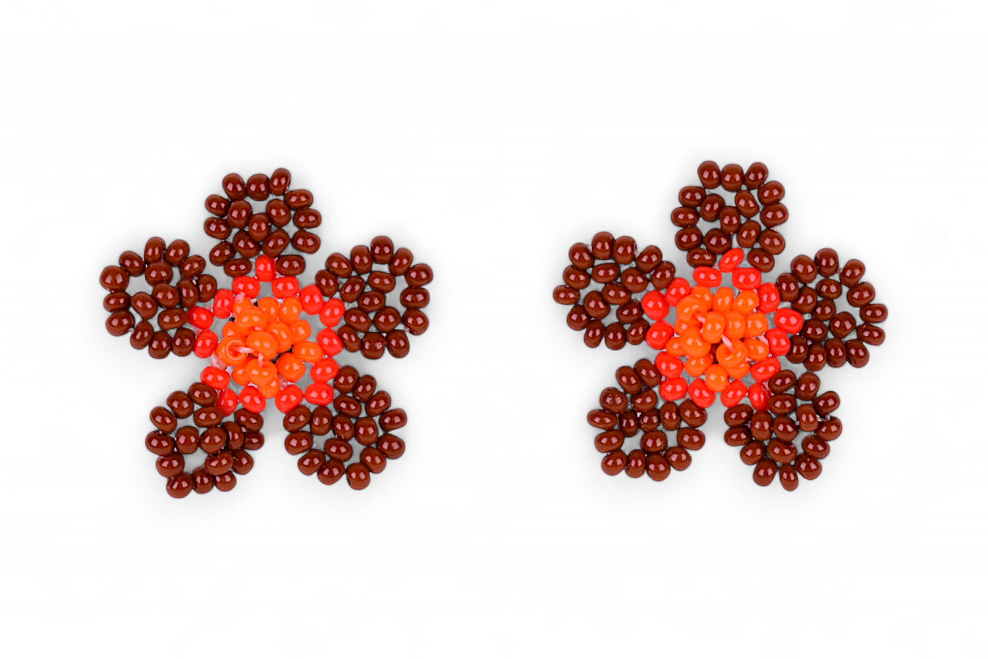 Make a bold and meaningful statement with these stunning floral earrings. Shaped like a blooming five-petal flower, this piece is handmade by Indigenous Embera Chami artisans using traditional beading techniques and carefully selected glass beads in earthy shades of brown, vibrant red, and orange.
