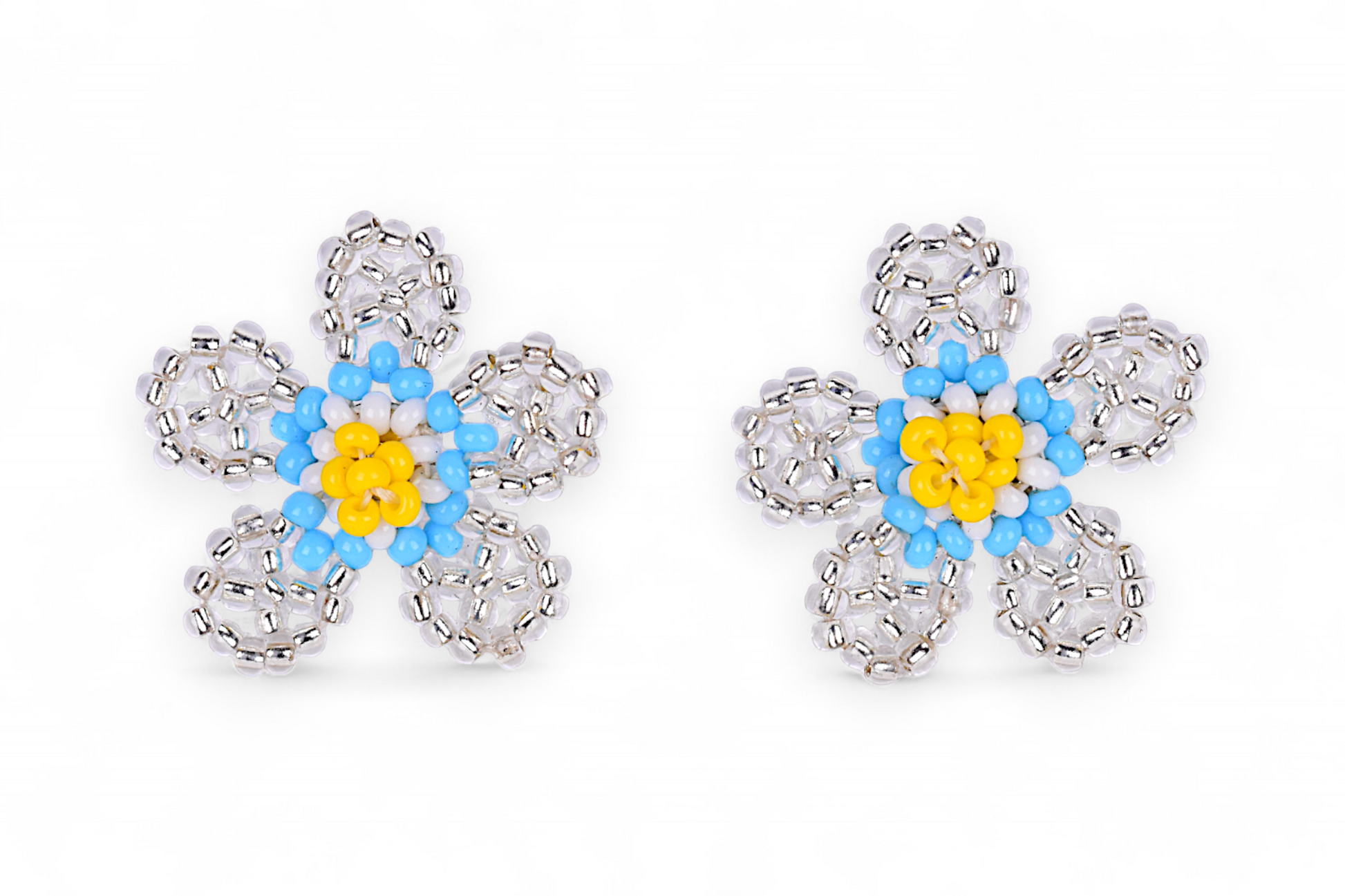 Make a bold and meaningful statement with these stunning floral earrings. Shaped like a blooming five-petal flower, this piece is handmade by Indigenous Embera Chami artisans using traditional beading techniques and carefully selected glass beads in shimmering silver, sky blue, bright yellow, and pure white tones.