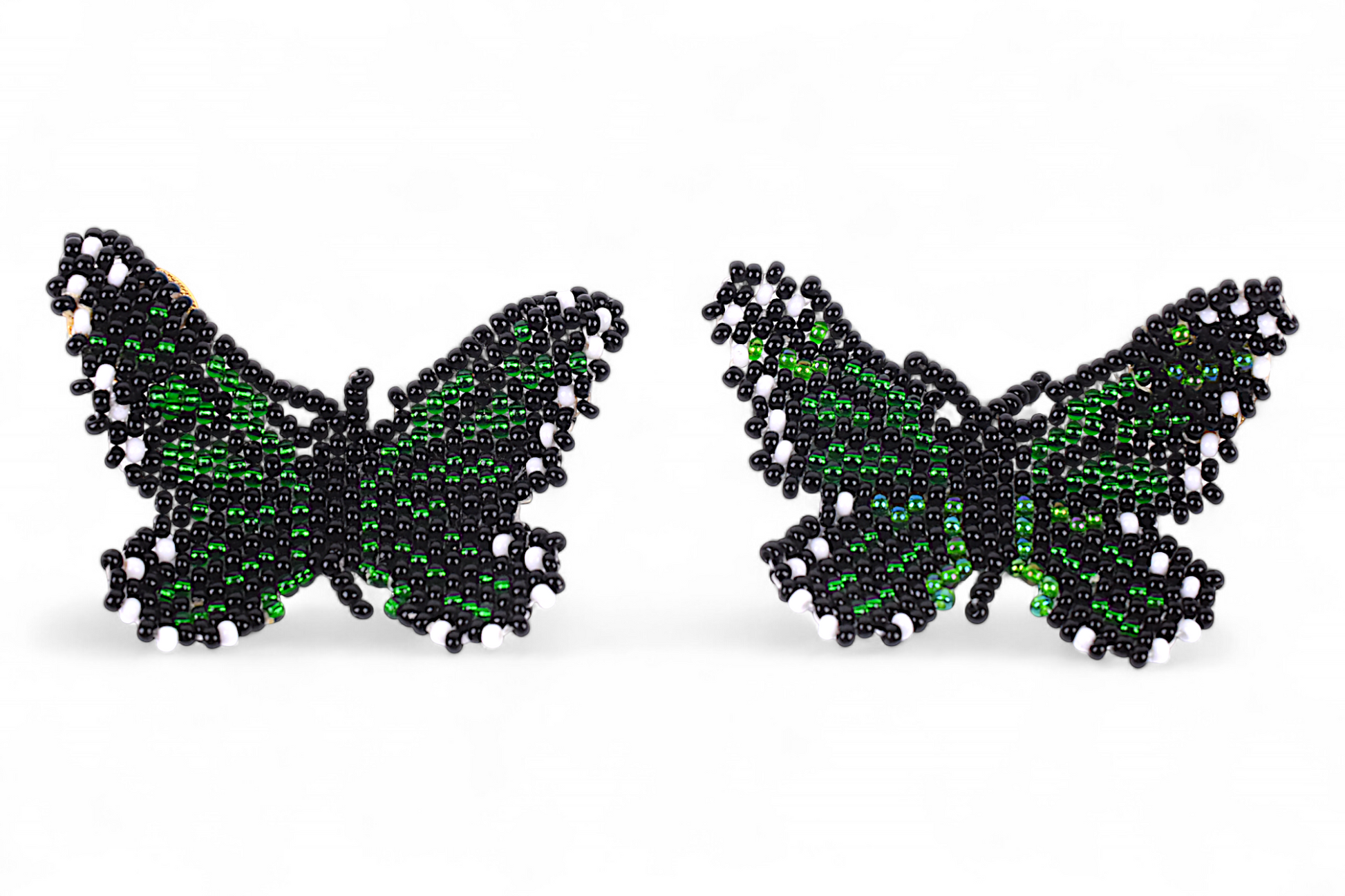 Make a bold and meaningful statement with these stunning butterfly earrings. Designed with a graceful winged silhouette, this piece is handmade by Indigenous Embera Chami artisans using traditional beading techniques and carefully selected glass beads in vibrant shades of green, black, and white.
