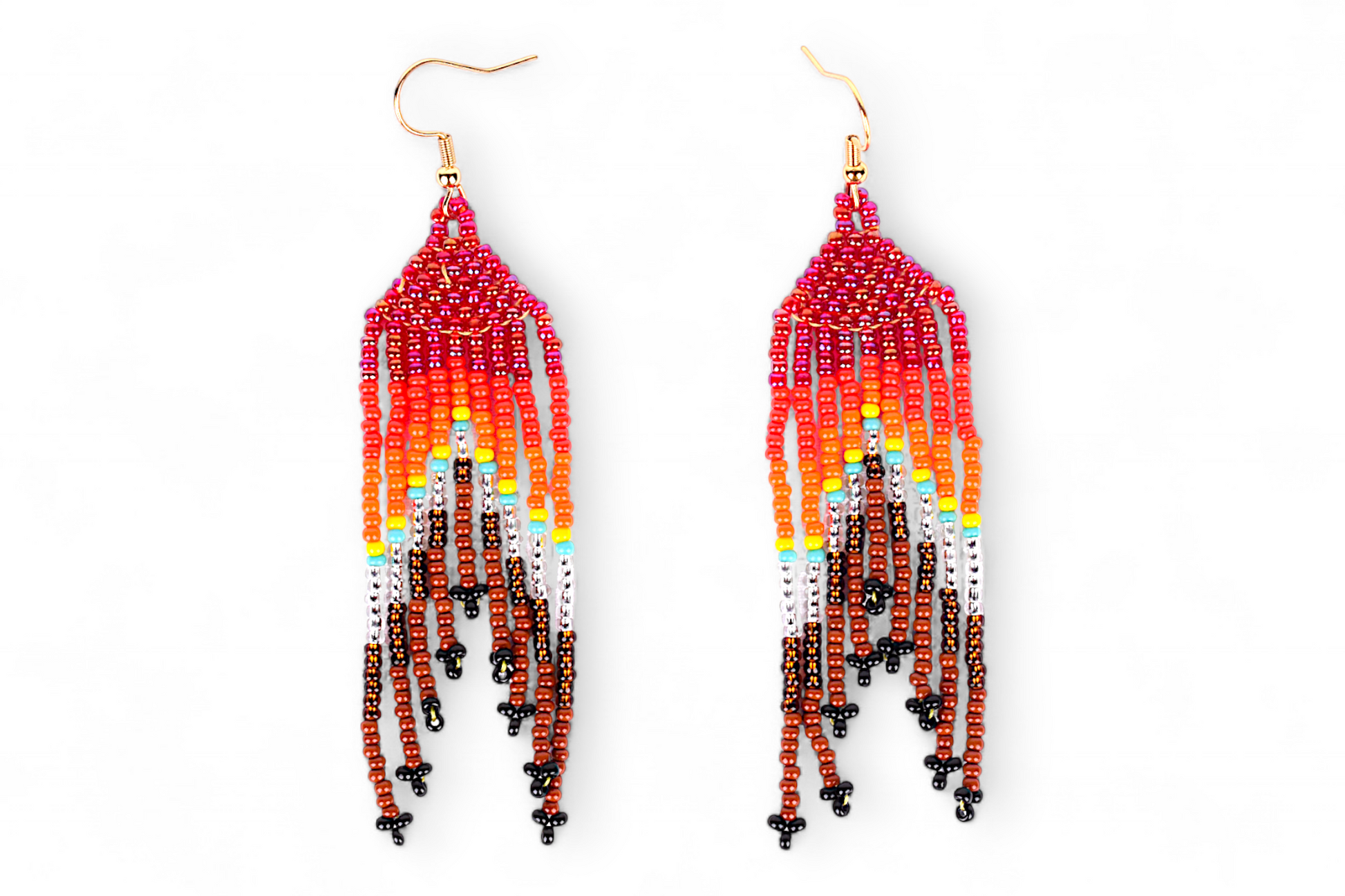 Make a bold and meaningful statement with these radiant mermaid tail-inspired earrings. Designed with intricate beadwork, they feature layers of magenta, fiery red, bright orange, golden yellow, earthy brown, shimmering silver, turquoise, and deep black. The long fringe design moves gracefully, capturing light and color with every step.
